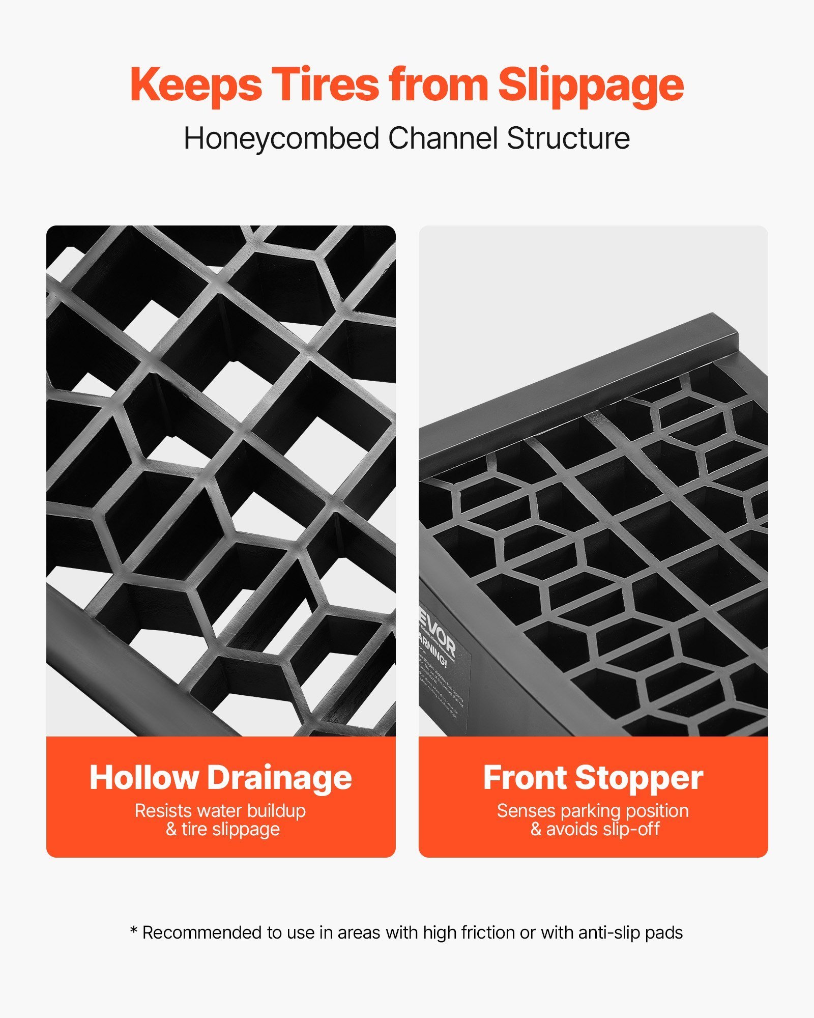 Special Design: Our oil change ramps feature a honeycombed surface to increase friction and improve drainage, which reduces dampness buildup and tire slippage. The curved shape fits the tire securely, keeping the vehicle stable and fixed in place