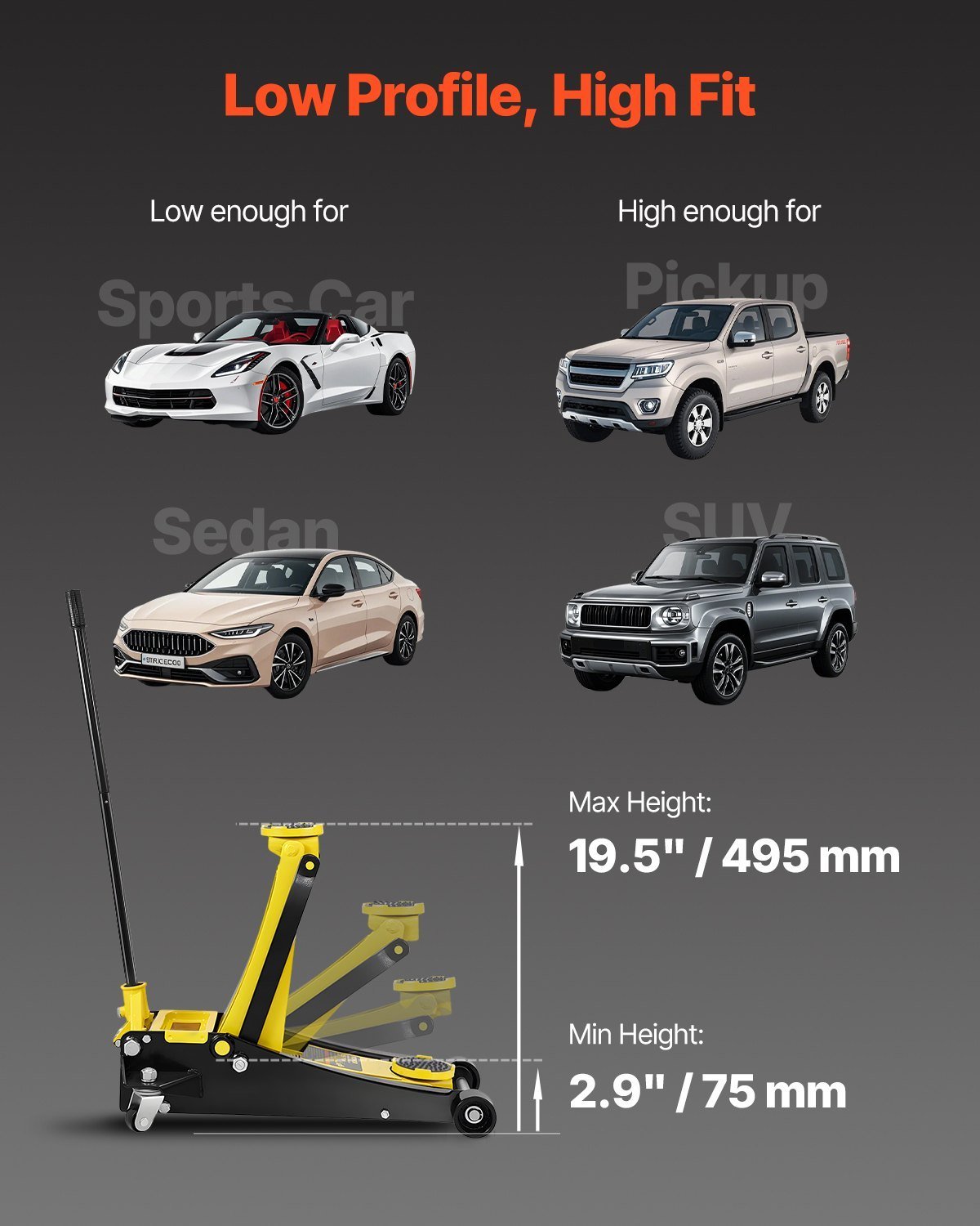 For All Your Lifting Needs: Min. Height: 3″/75 mm. Max. Height: 19.49″/495 mm. The wide lifting range meets your lifting needs of family cars, trucks, SUVs, etc. And a dual parallel pump system allows you to lift to the highest in full 7 strokes. Speed up your process.