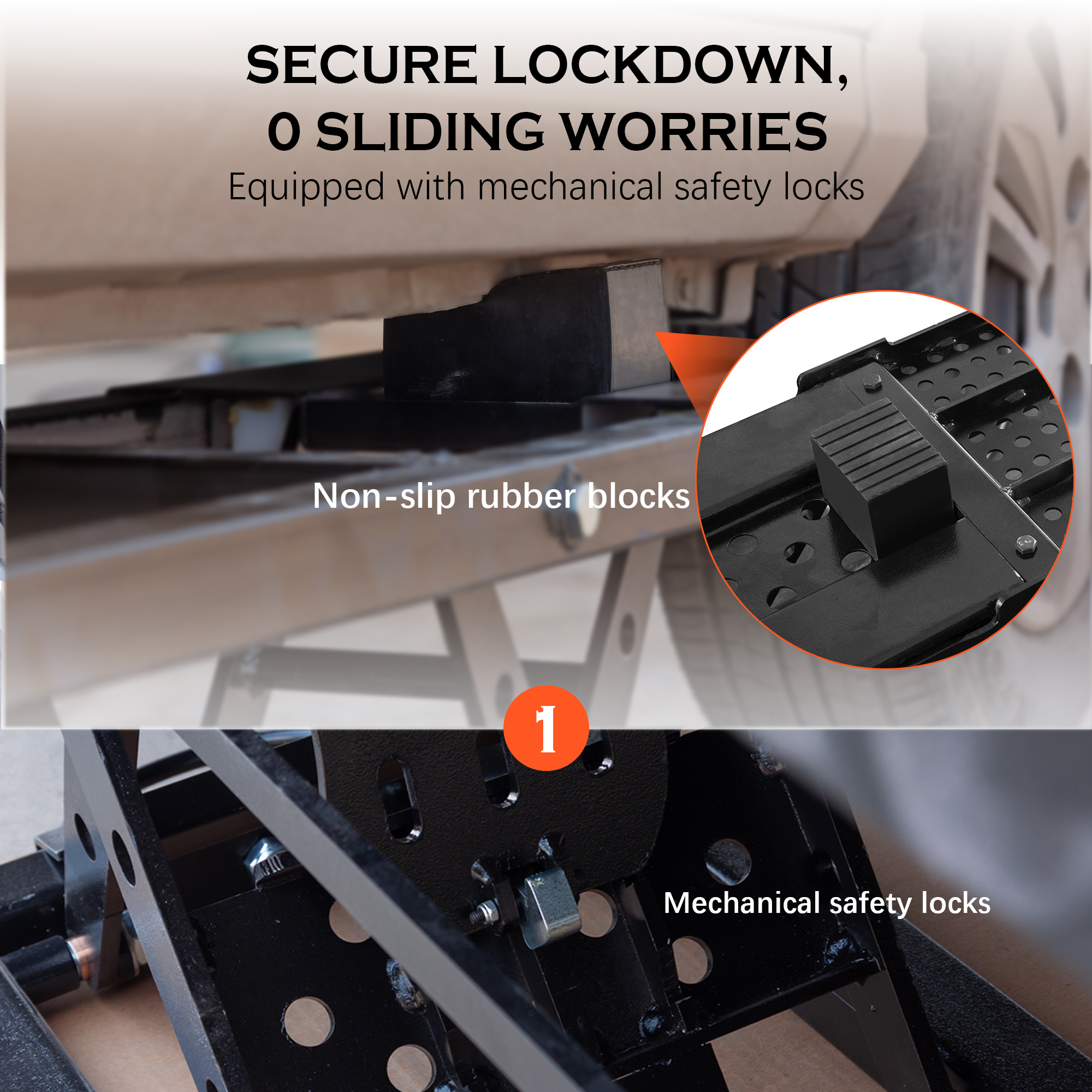 - [Enhanced Safety with Mechanical Locks] Designed with reliable mechanical safety locks that securely hold the vehicle at your desired height, preventing unintended movement. Always remember to manually release the safety lock before lowering the lift. For detailed instructions, please refer to the included video guide.