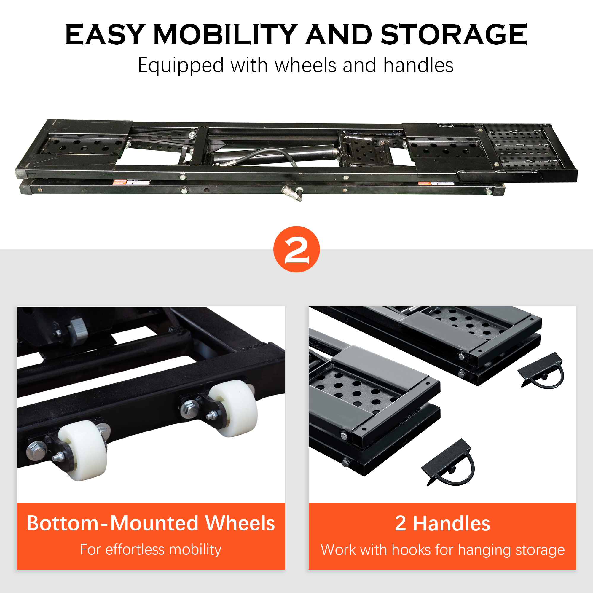 - [Easy to Move & Store with Folding Design] Equipped with four high-strength nylon wheels for effortless portability. When not in use, the lift can be folded compactly for convenient storage. Two sets of handles are included, allowing wall-mounted storage to save space (hooks or nails not included).