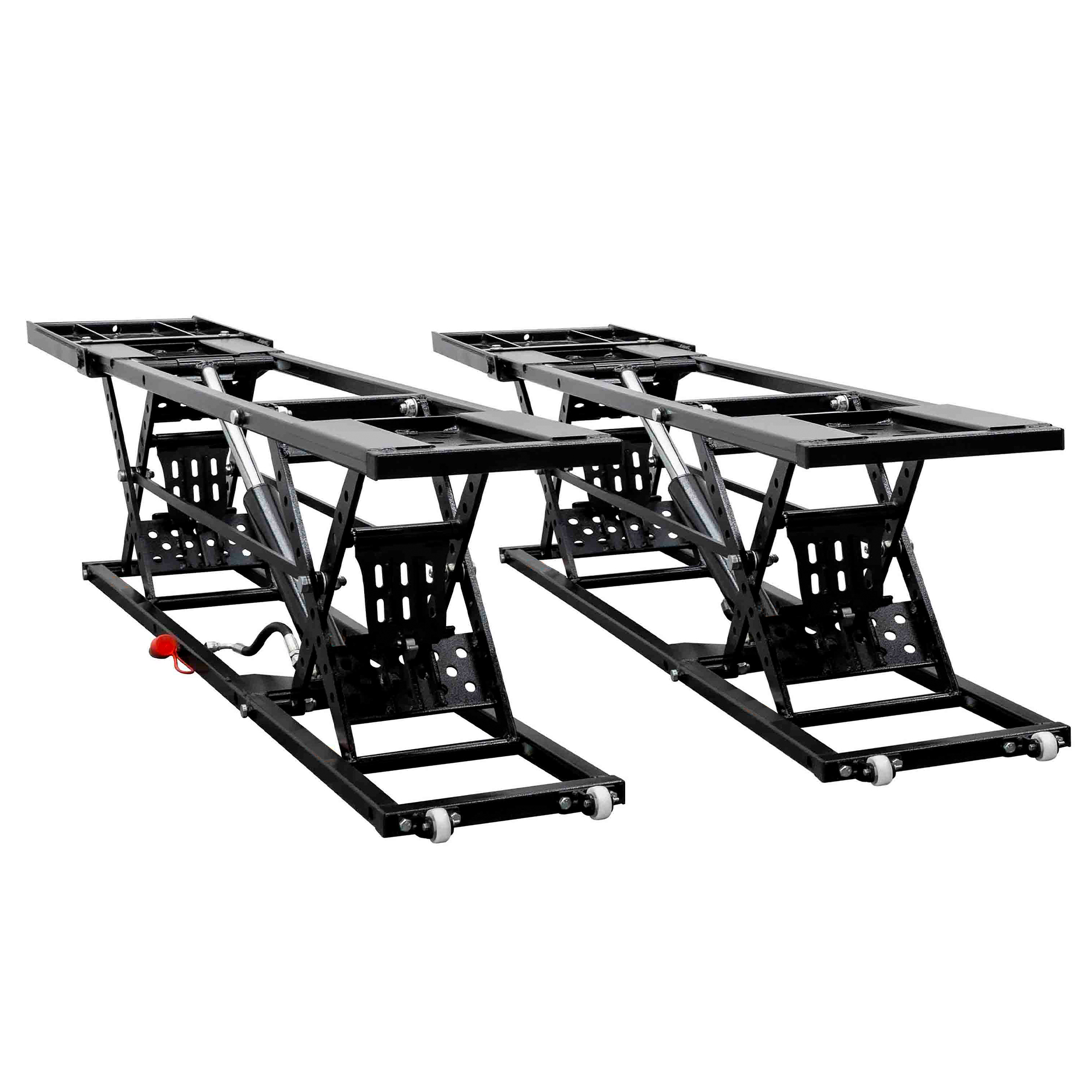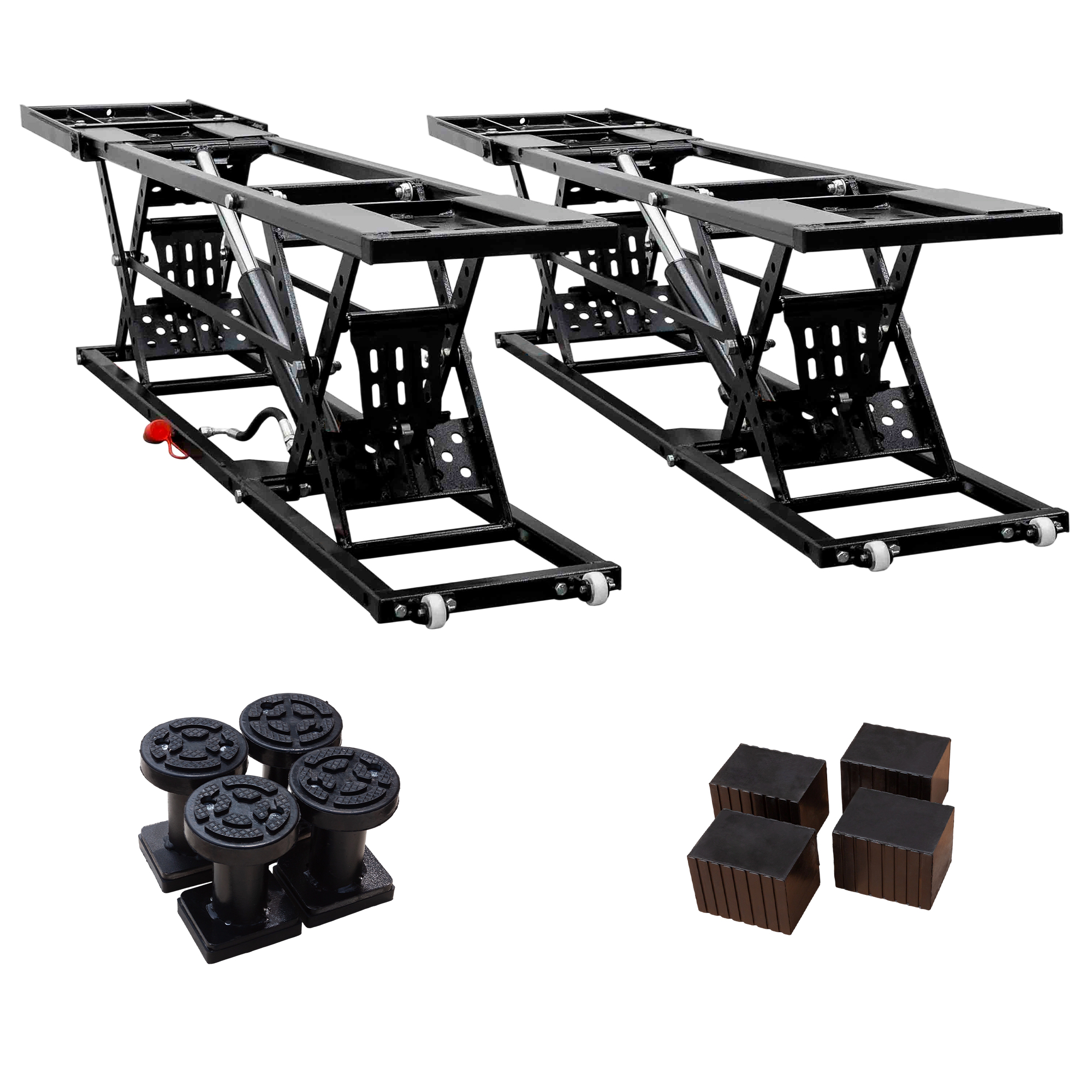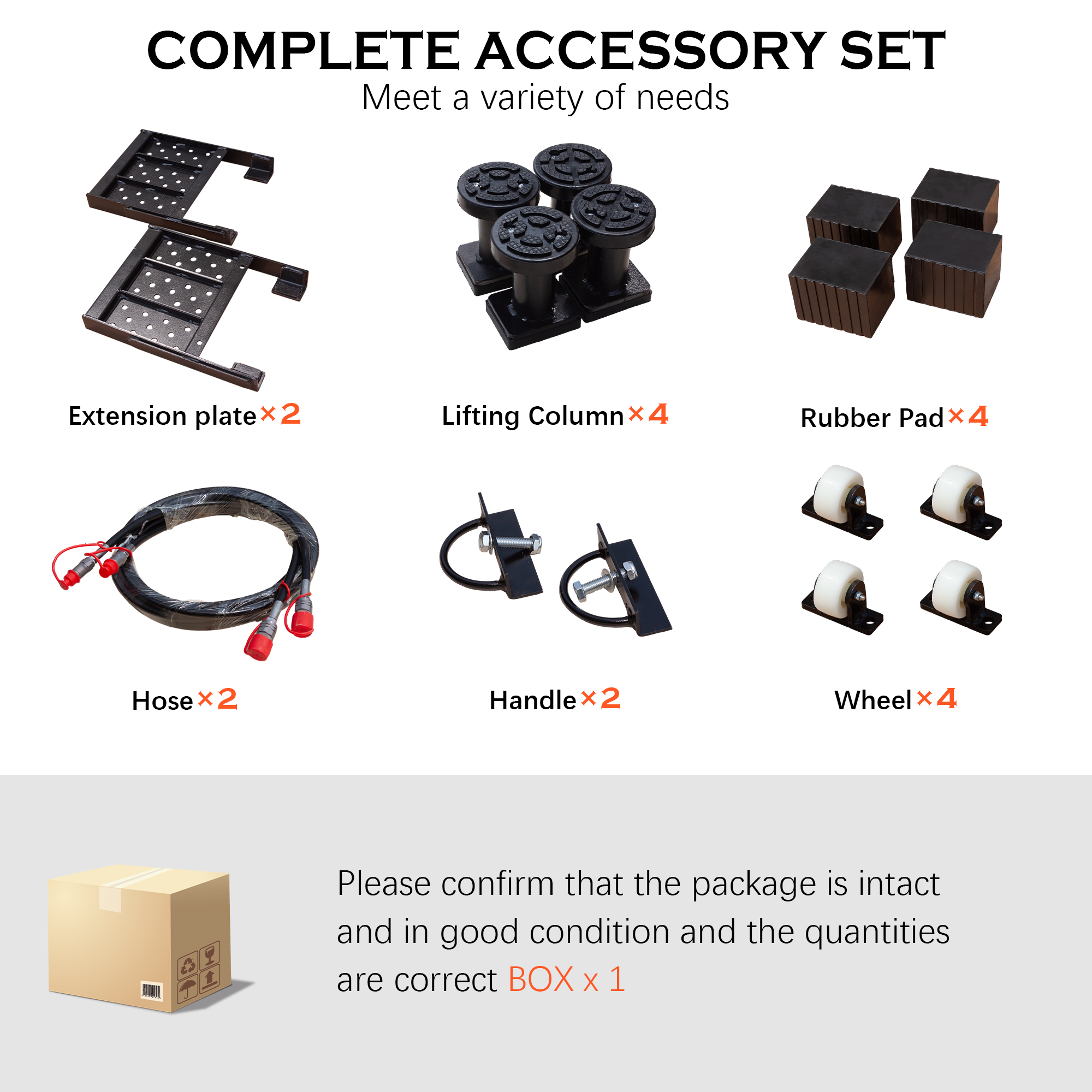 - [Complete Kit, Ready to Use] Comes with all necessary accessories: 4 rubber pads, 4 lifting columns, 2 hoses, 2 extension plates, 2 handles, 4 casters, 8 hex bolts (M8 x 16mm), 4 hex bolts (M10 x 55mm), 4 flat washers, 4 hex nuts ( M10), and a user manual. Everything you need is included for quick setup and reliable operation.