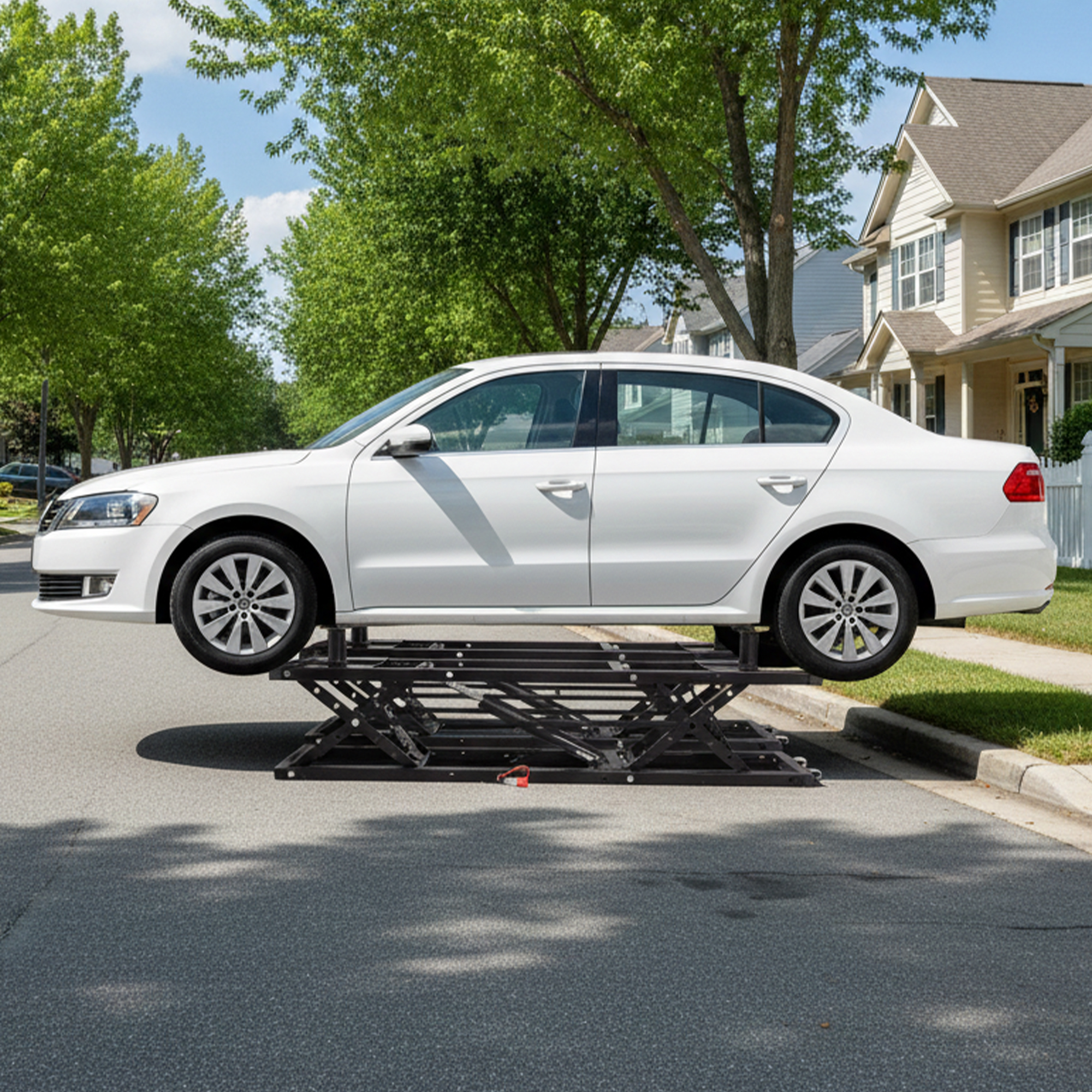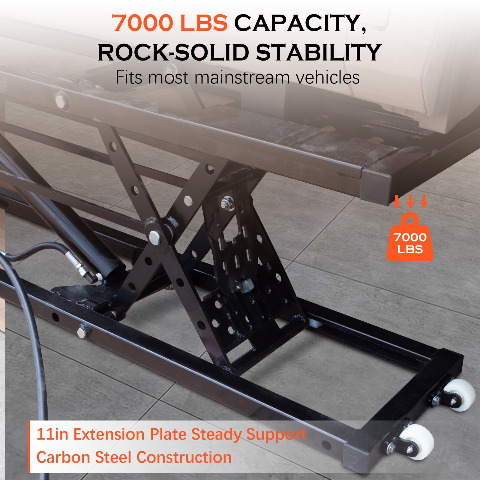- [Heavy-Duty Construction & Extended Support] Built from high-strength Q235B carbon steel, this lift offers robust stability with a weight capacity of up to 7000 lbs. The 11-inch extension plates widen the contact area, making it suitable for long-wheelbase vehicles, trucks, SUVs, and most common models. For optimal safety, use only on flat, solid surfaces (not recommended on slopes).